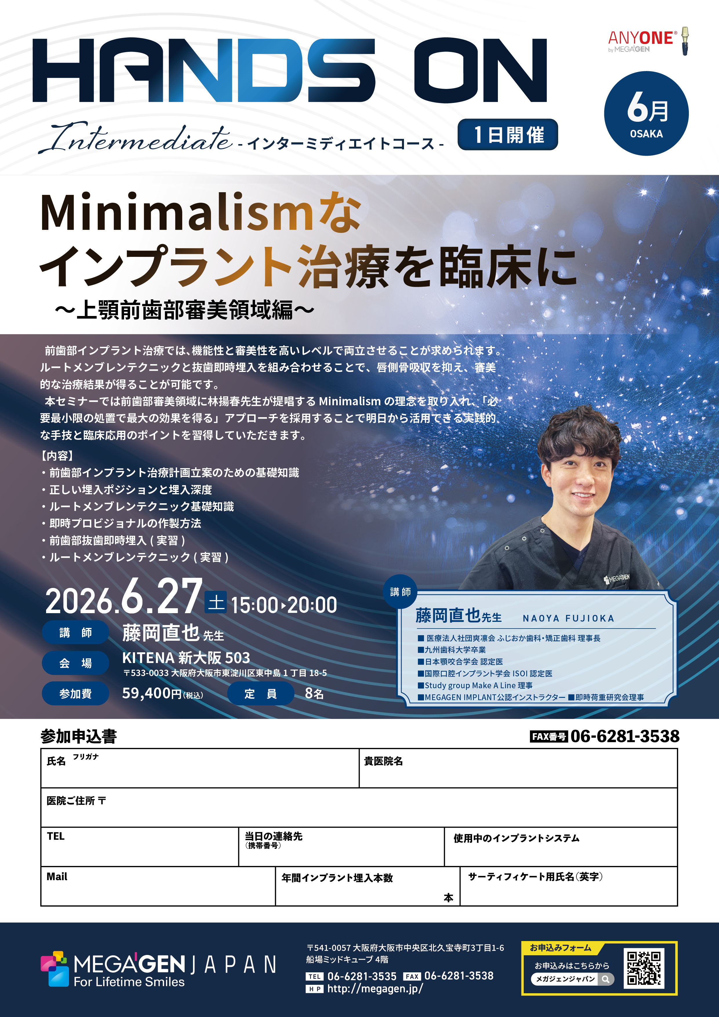 ※ご応募を多くいただいている場合、メガジェンインプラントの導入を検討されている先生、まだハンズオンセミナーを受講いただいていない先生を優先させていただいております。