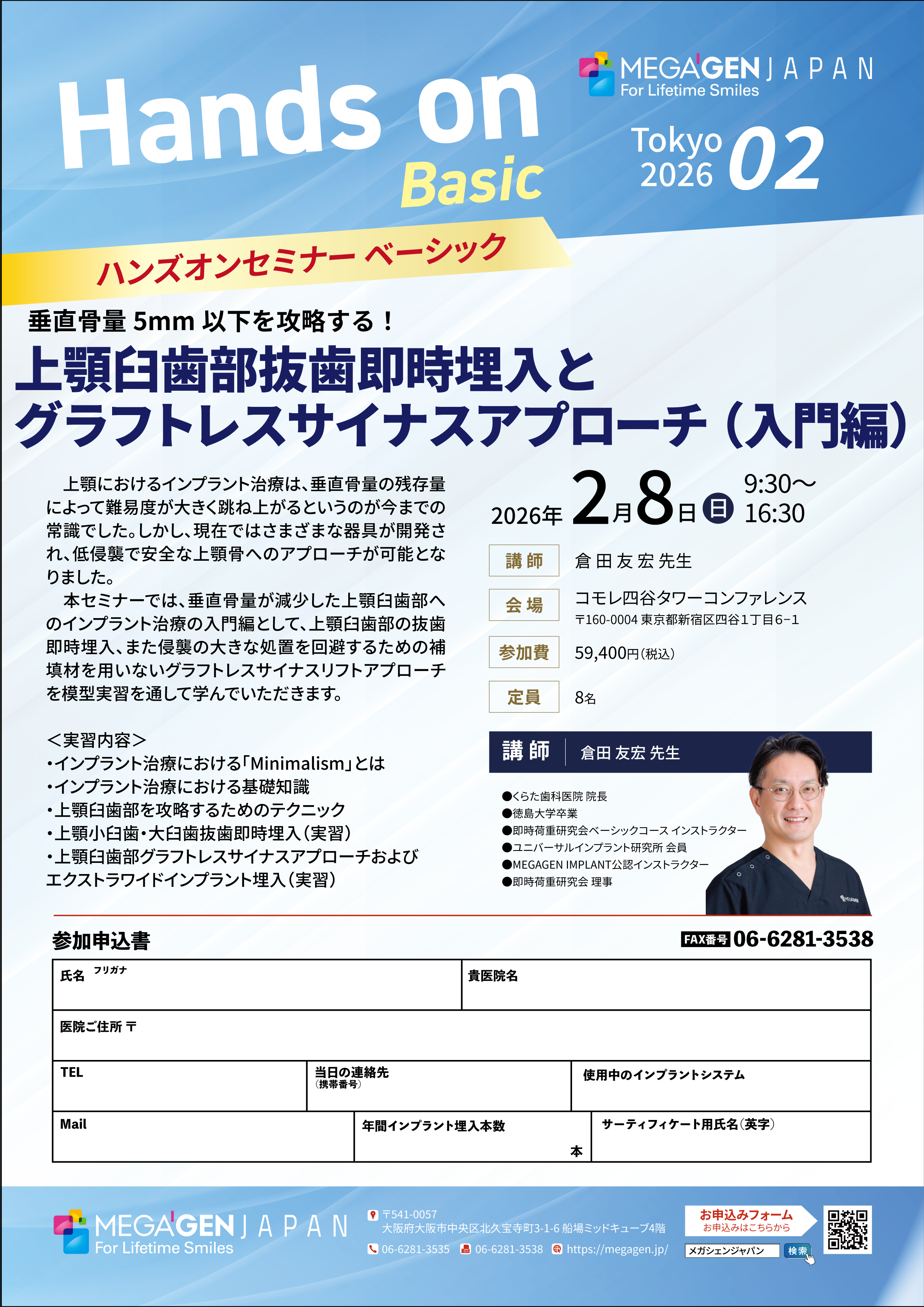 | 定 員 | 15名 ※ご応募を多くいただいている場合、メガジェンインプラントの導入を検討されている先生、まだハンズオンセミナーを受講いただいていない先生を優先させていただいております。予めご了承ください。 |