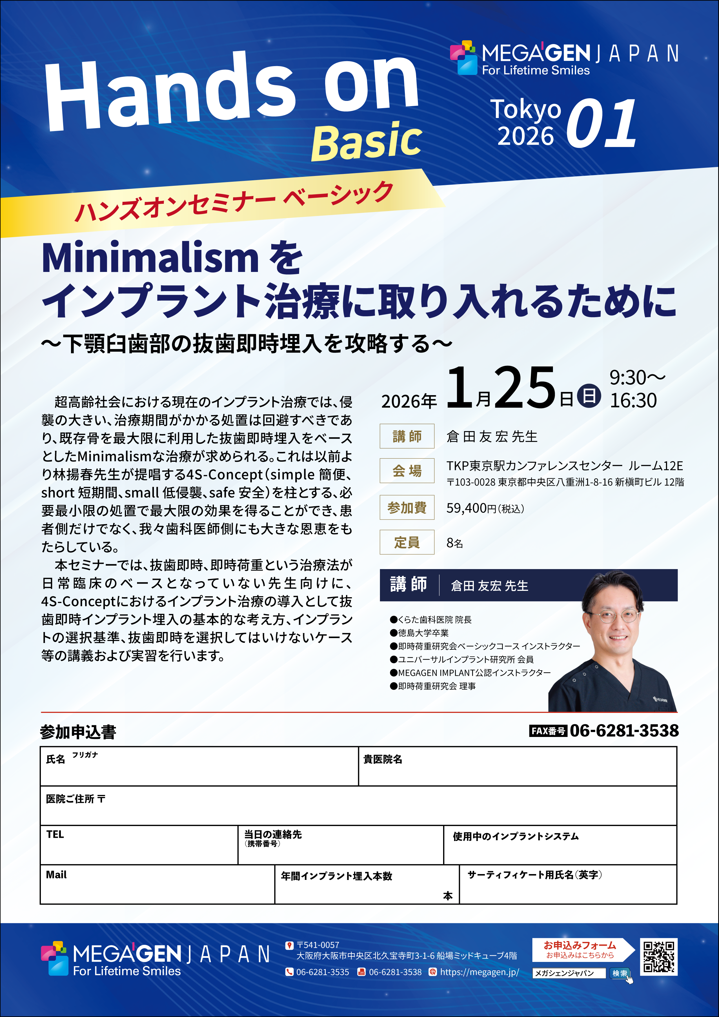※ご応募を多くいただいている場合、メガジェンインプラントの導入を検討されている先生、まだハンズオンセミナーを受講いただいていない先生を優先させていただいております。