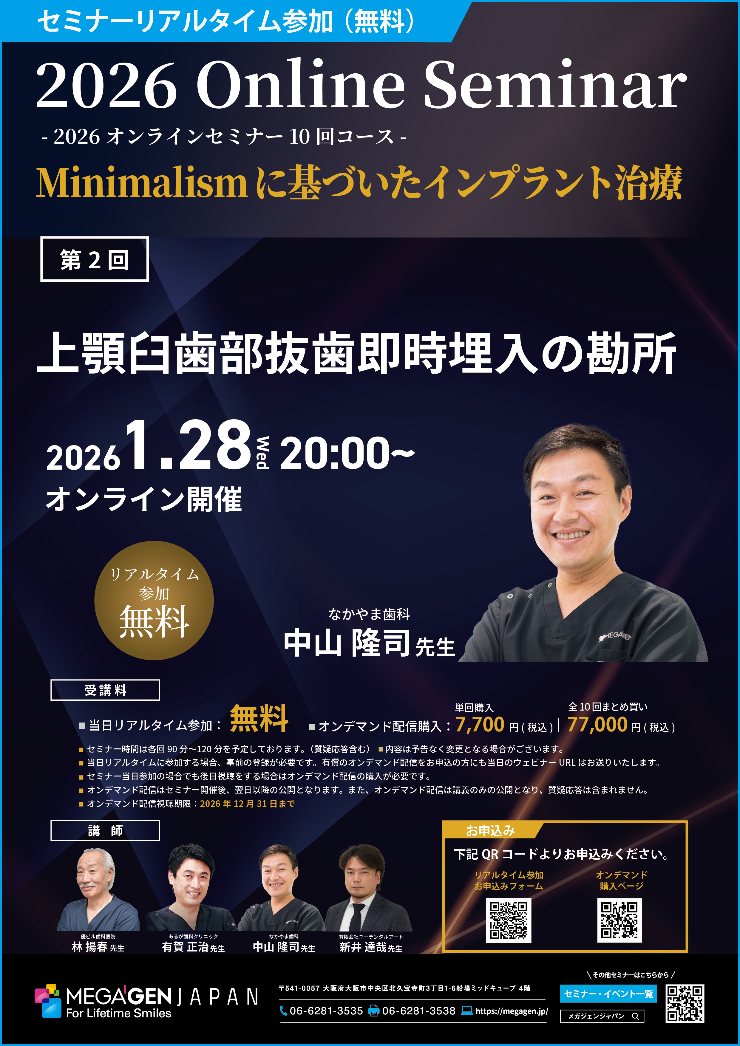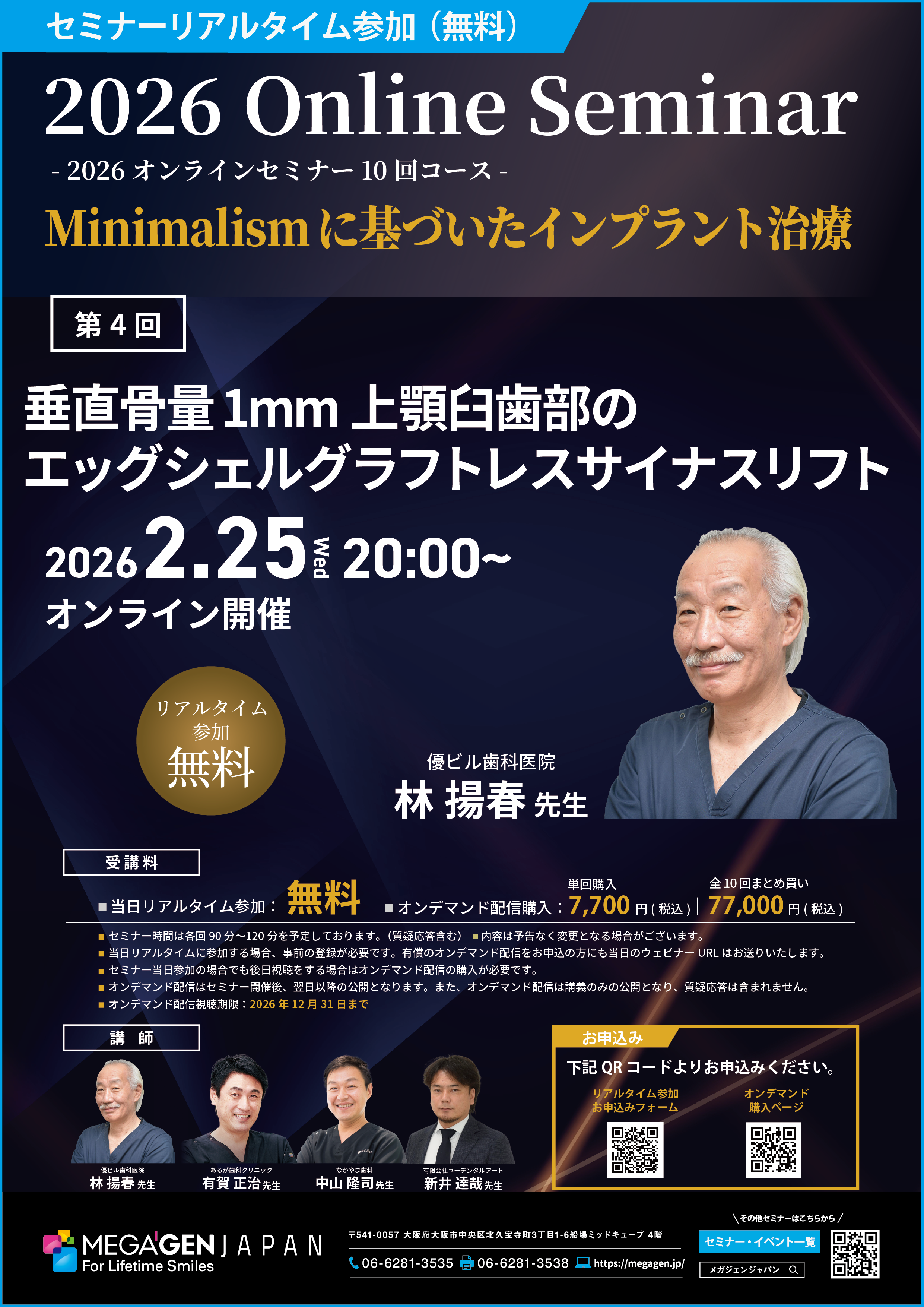 - 【リアルタイム視聴】2026オンラインセミナー10回コース_第4回「垂直骨量1mm 上顎臼歯部のエッグシェルグラフトレスサイナスリフト」