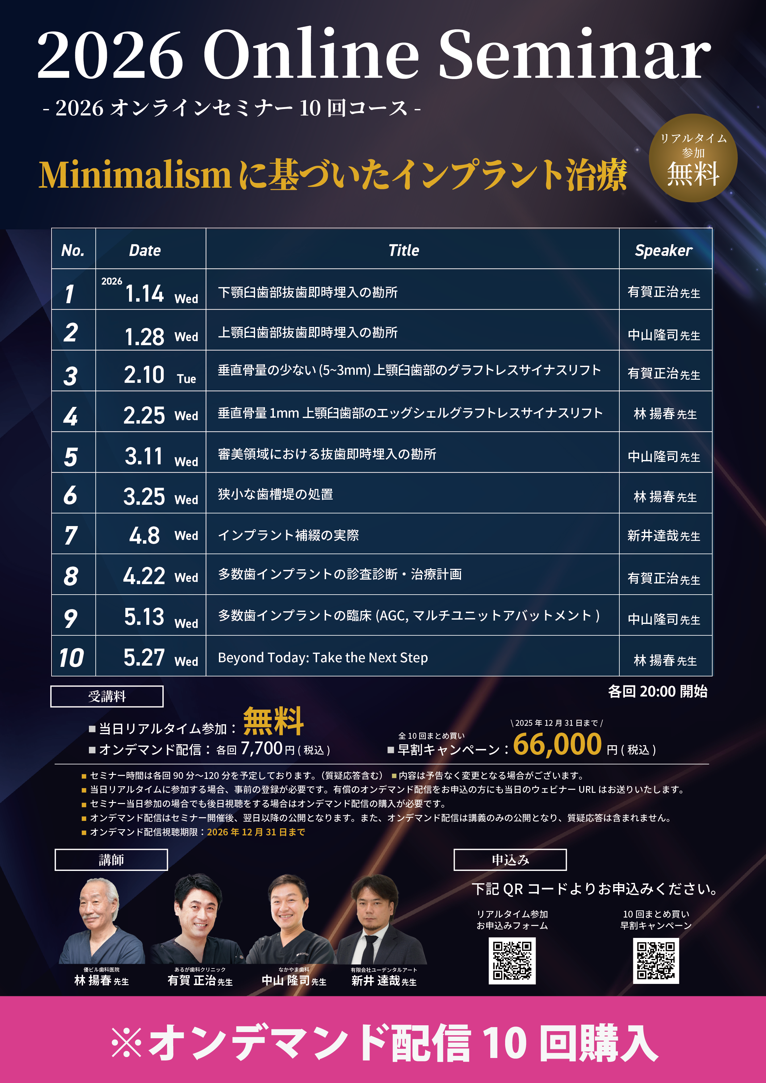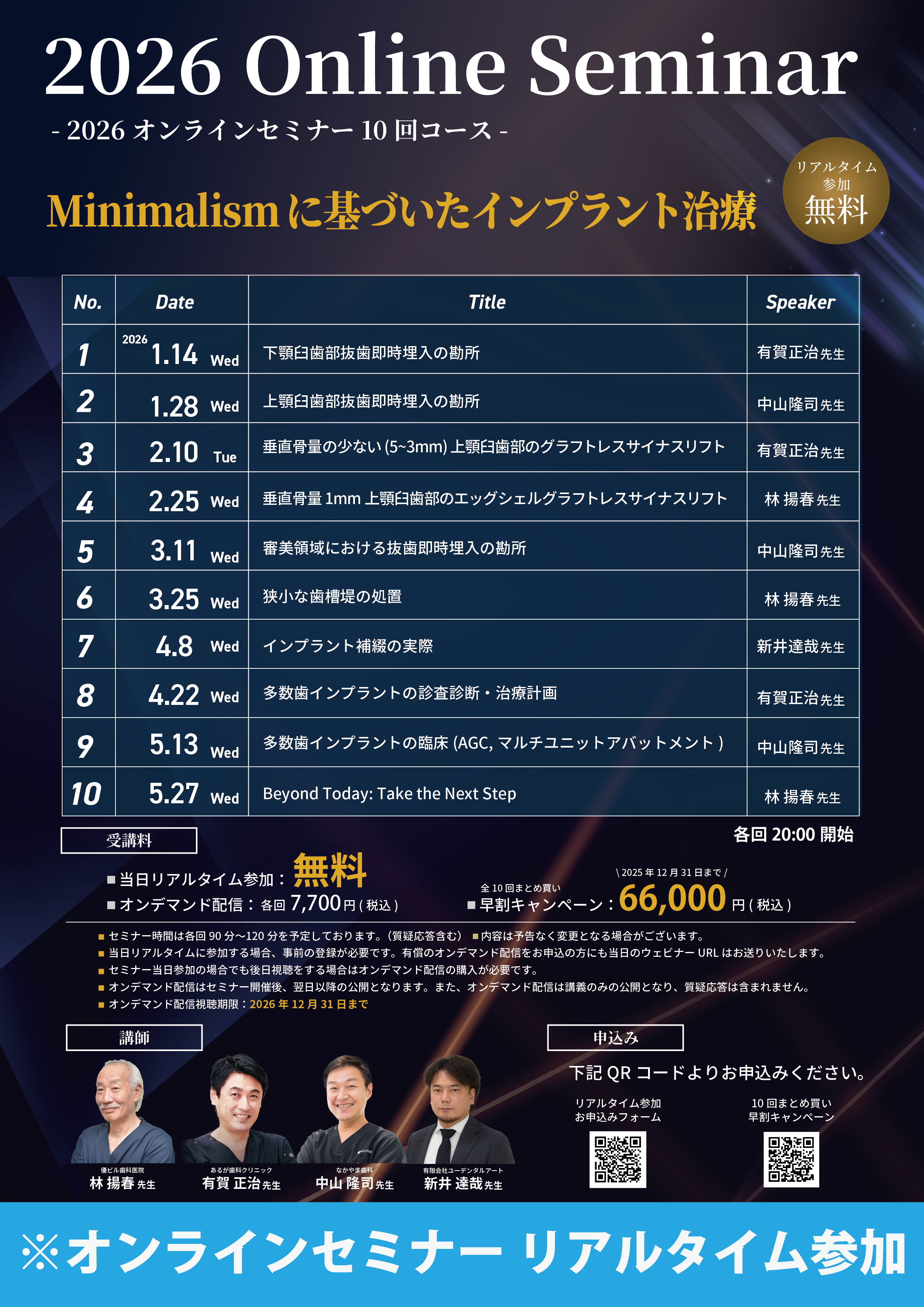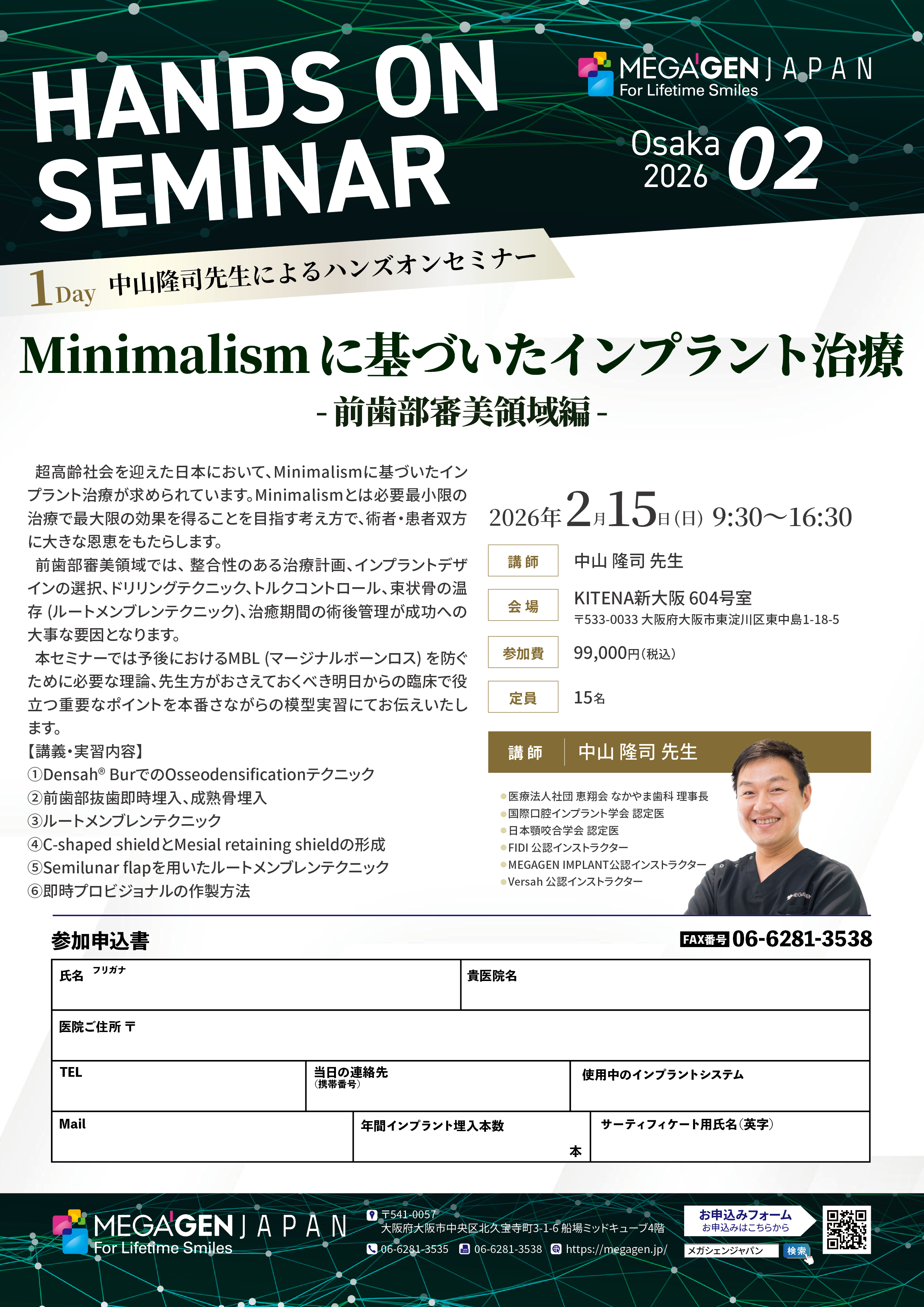 | 講義内容 | 先生方が日々のインプラント治療における疑問点やお悩みの症例を気兼ねなくご相談いただける機会を設けました。 相談内容は治療計画・埋入位置,埋入方向・ドリリング・補綴形態など、内容は問いません。 4S-Conceptに基づいた低侵襲な治療に向けて、MEGAGENインストラクターの藤岡直也先生に日頃の疑問点やお悩みをご相談ください。 【内容】 ・インプラント治療、症例における疑問点やお悩みを相談、 ディスカッション ・講師の先生による症例供覧 セミナー終了後、懇親会を予定しております。 (希望者のみ、会費別途) |