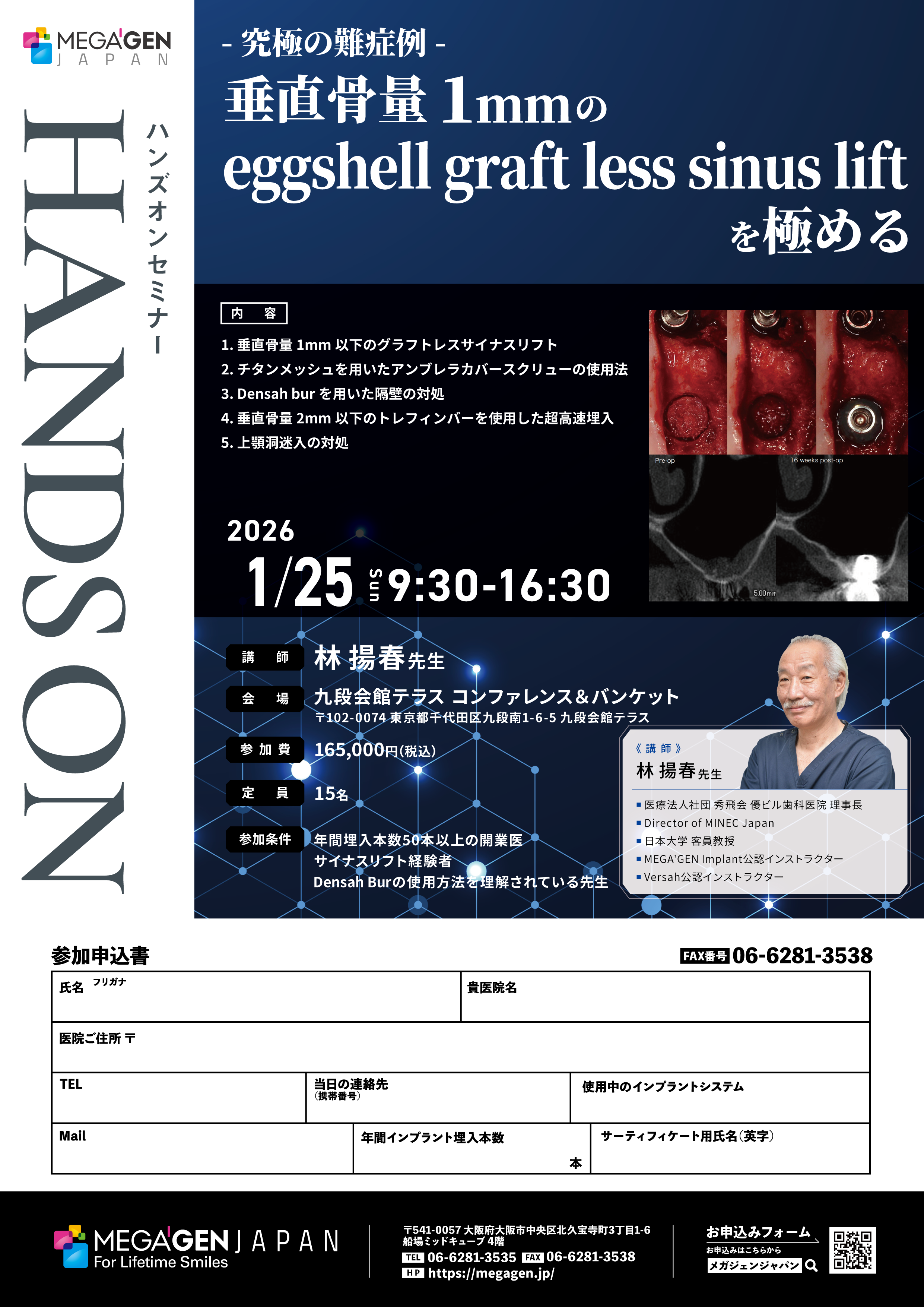※満員御礼 【東京Advance】林揚春先生による1Dayハンズオンセミナー 究極の難症例 垂直骨量1mmのeggshell graft less sinus liftを極める ※参加条件あり
